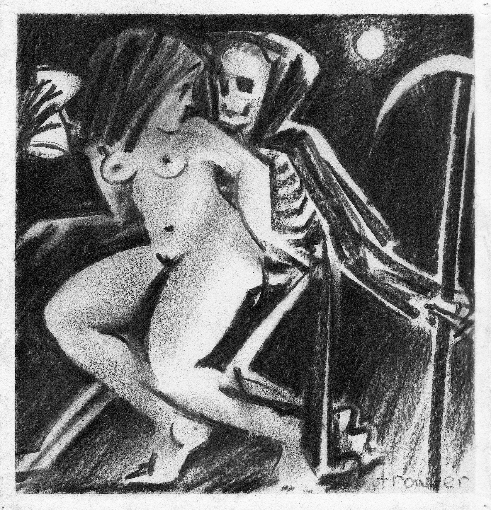In the painting, I have reached a more defined image and have changed the poses somewhat. Although the hourglass is missing, I think that the way that Death now clutches his victim makes for a more dramatic relationship between the two.