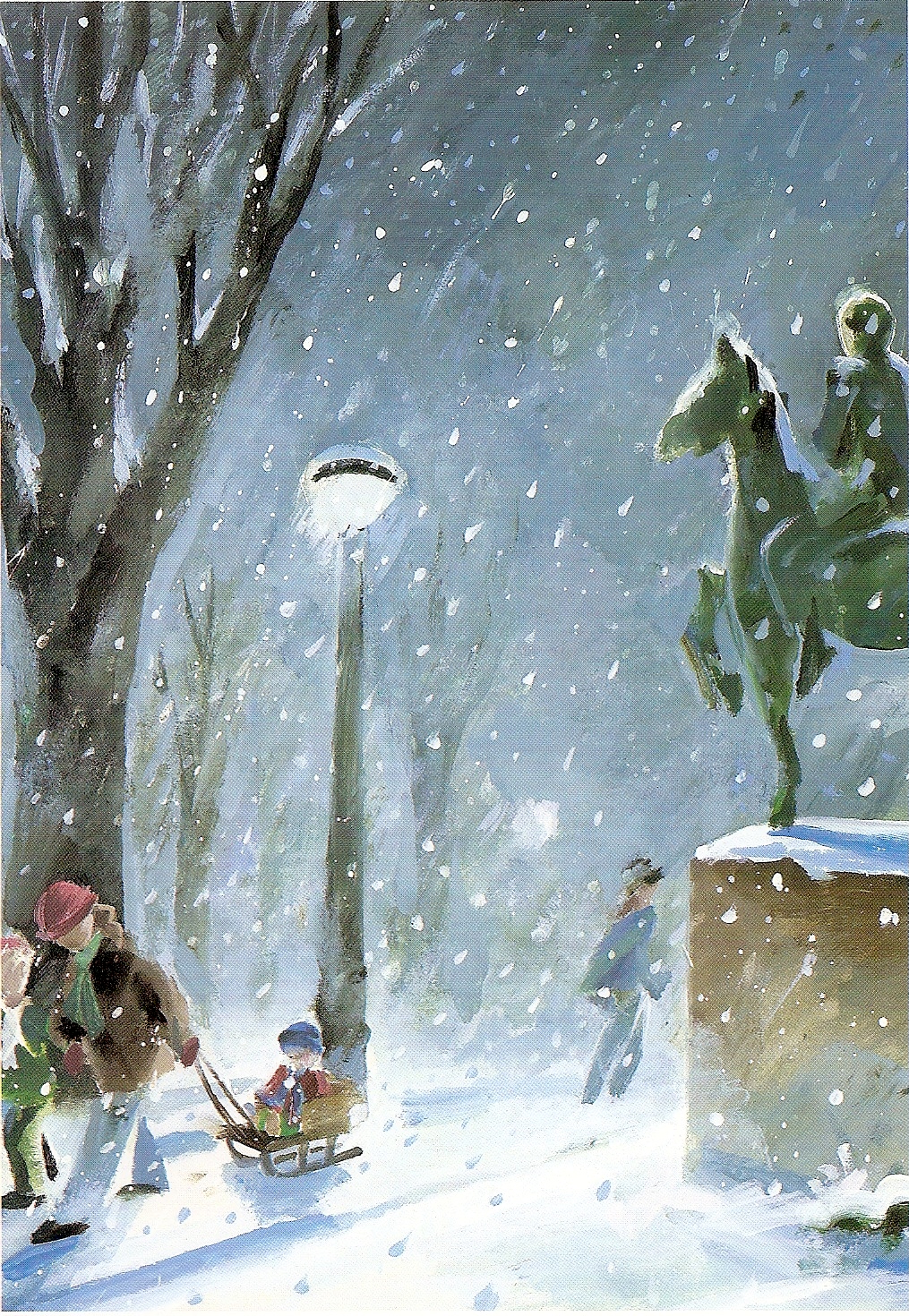 Today’s blog will feature a couple of illustrations I did 25 years ago. Although both depict winter scenes for Christmas, they were painted in the full heat of summer in my un-air-conditioned studio, which is why I thought of them today. I hope in seeing them they will have the same cooling effect for you.