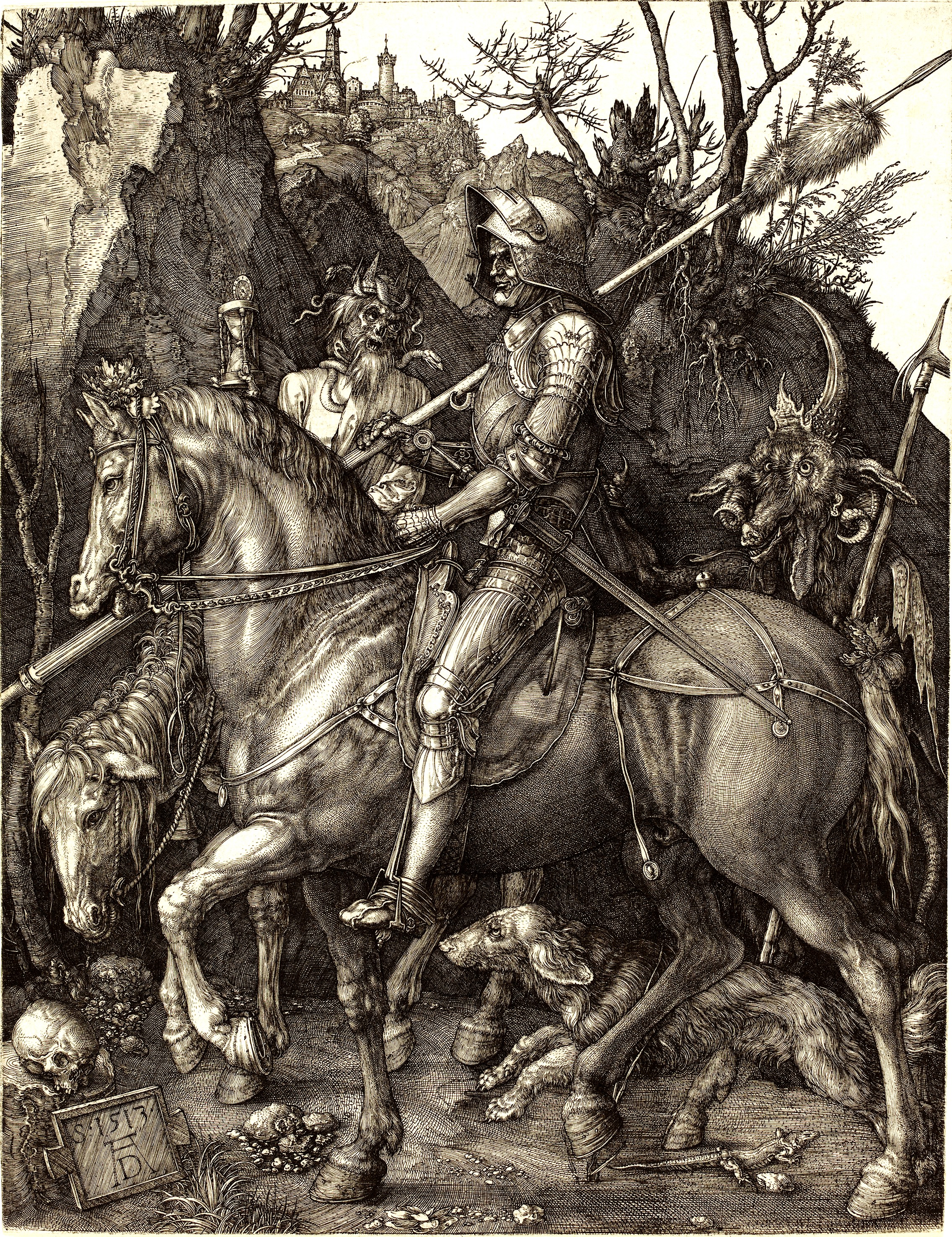 The armed and armoured knight canters into battle on his noble steed, driven by thought of glory or plunder, we cannot tell. Beside him, death with his crown and aura of decay, tries to remind him, with little success, of his temporal nature. Behind them trots the devil, primal, beastly, and keen to spur the party on to any evil that could unfold. This is my interpretation of Albrecht Dürer’s well-known engraving. I have recently been to see collections of paintings in Vienna and Berlin and seen many of his works first-hand.