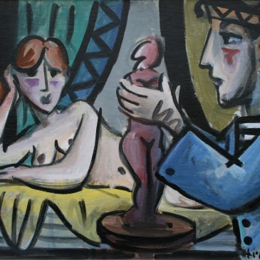 This week we are presenting two oil sketches on the same theme, the painter and his model. I applaud the way this artists lines echo the curves of his model. Mostly done in black,orange and browns, this one is full of textures, as it was painted over an autumnal landscape, which you can still see … More Painter and Model